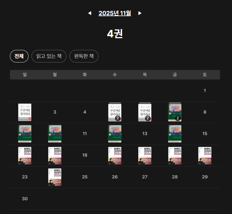 지난 10월 복기에 이미 예고가 되어 있었지만, 다른 모든 것들에 우선하여 녹음과 믹스, 그리고 영상 작업에 집중하였기에 11월 독서 기록은 처참합니다. 밀리의 서재 독서 캘린더가 있는 그대로를 잘 보여주고 있는 것 같습니다. 그래도 중간에 자전거 타면서 오디오북으로 들었던 이하영 작가님의 책 '인생의 연금술' 책이 큰 힘이 되었네요.