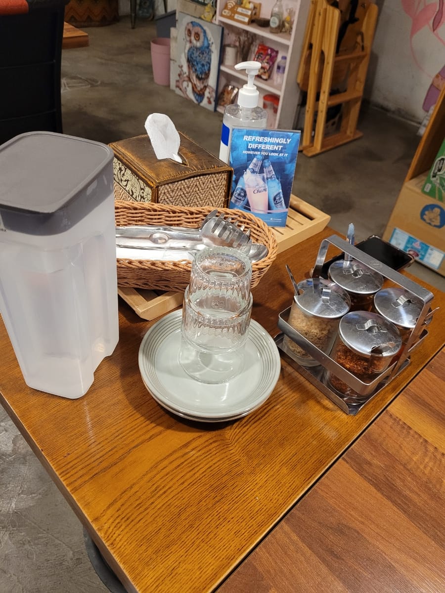 테이블마다 컵, 그릇, 수저, 젓가락,