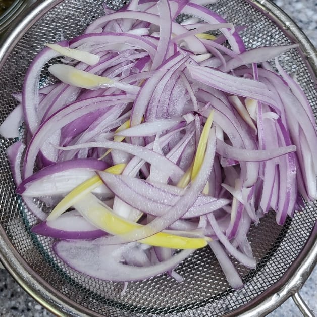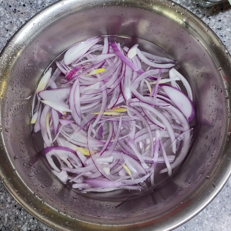 적양파는 가늘게 채 썰어 물에 5분 정도