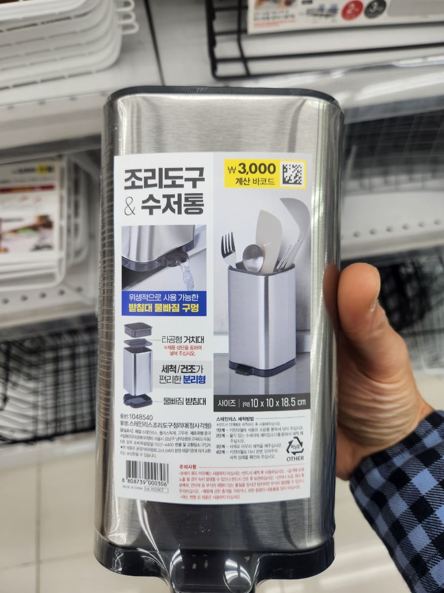 다이소 플라스틱, 스테인리스, 또는 철제 재질이 많으며, 주방 상판이나 식기 건조대 옆에 세워놓고 사용하는 가장 기본적인 형태입니다.