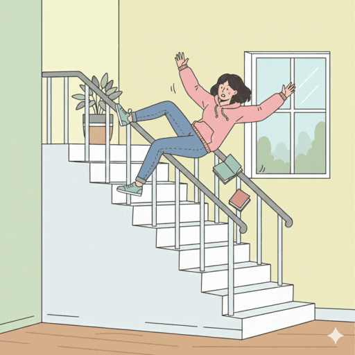 계단은 보통 목표를 향해 차근차근 올라가는 과정을 의미합니다. 그런데 그런 곳에서 떨어지게 된다면, 중간에 목표 달성이 좌절되거나 목적을 상실하게 되죠.