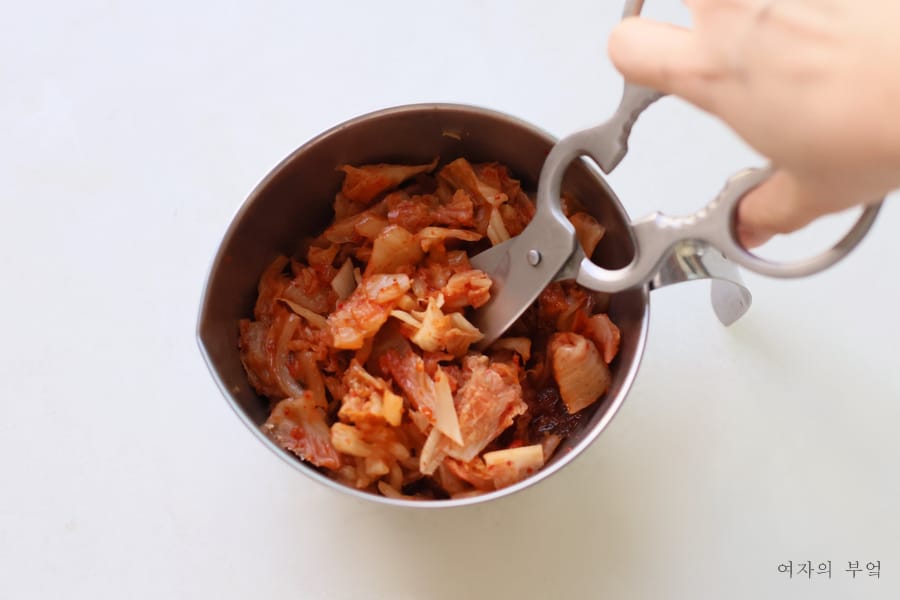 김치는 양념을 걷어내고 칼이나 가위로 잘게 다져서 준비한다.