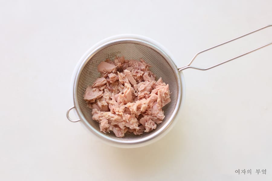 참치캔은 체에 걸러서 기름기를 뺀다.