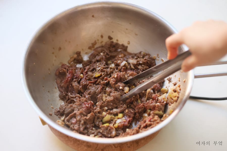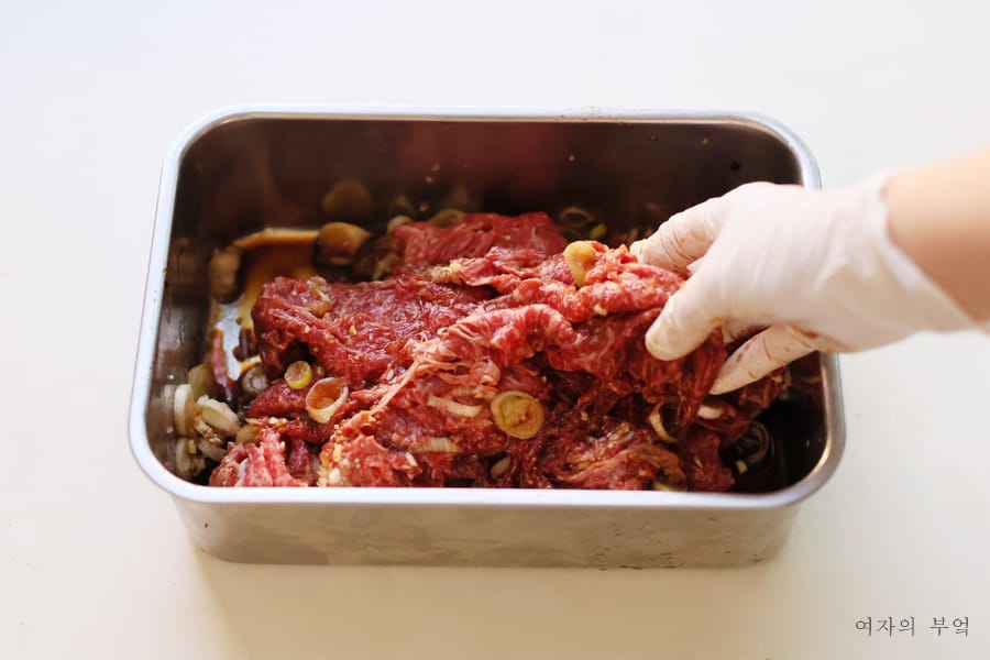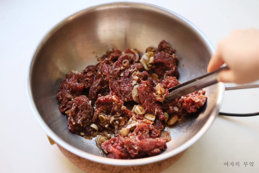 핏물 닦아낸 고기에 소불고기양념 넣고 골고루 버무린다.