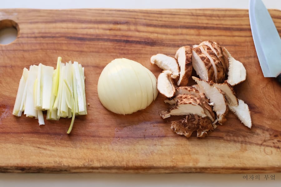 대파는 하얀 줄기를 길게 잘라서 준비하고 양파는 채썰기 한다.