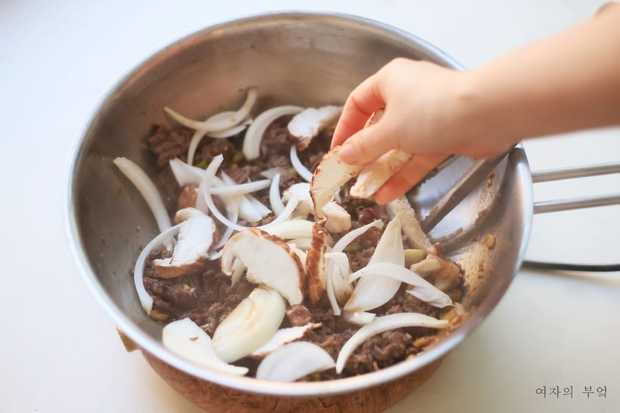 고기가 80% 정도 익으면 양파와 표고버섯을 넣고 볶는다.