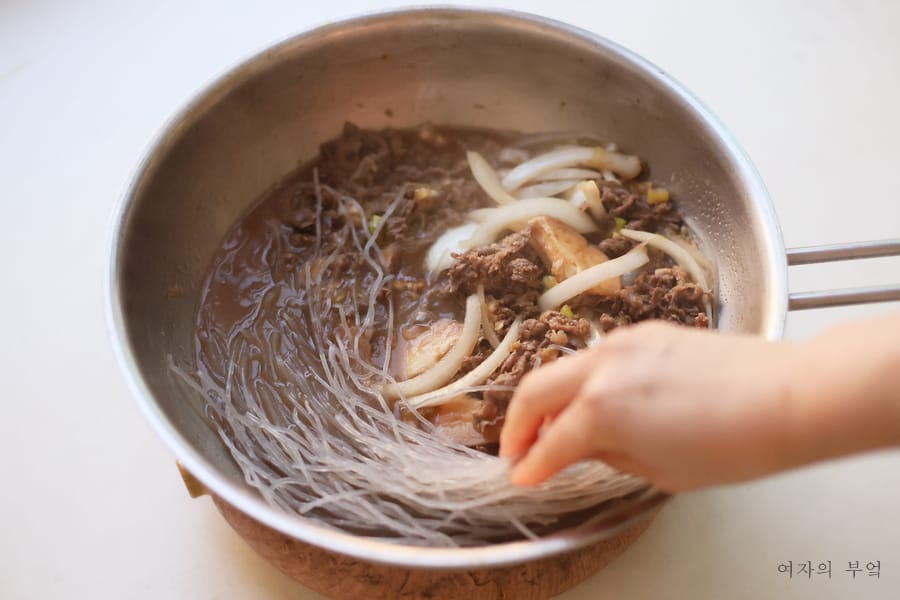 멸치육수를 붓고 육수 한 쪽에 불린 당면을 넣어 익힌다.