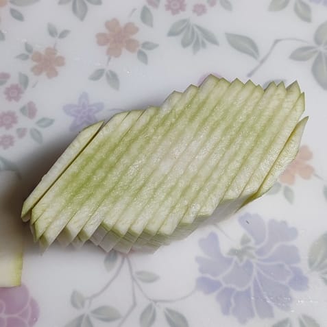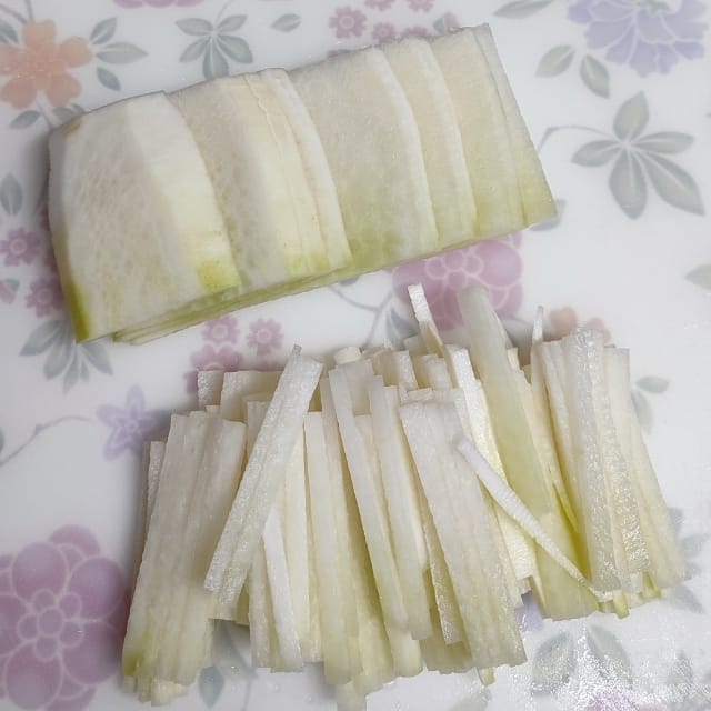 결 방향대로 채 썰어 주세요.