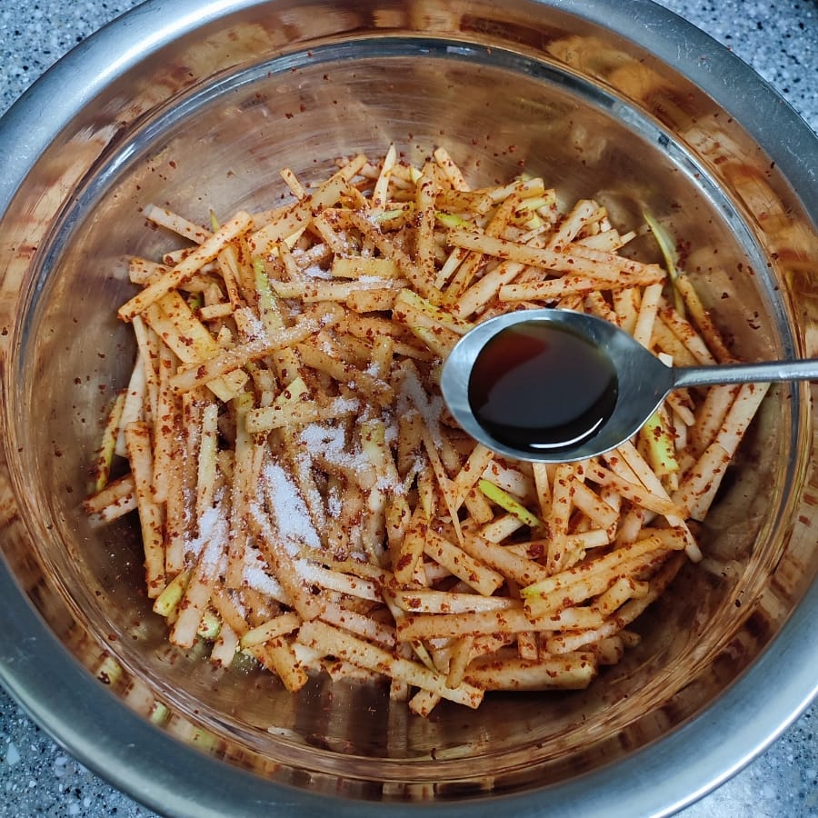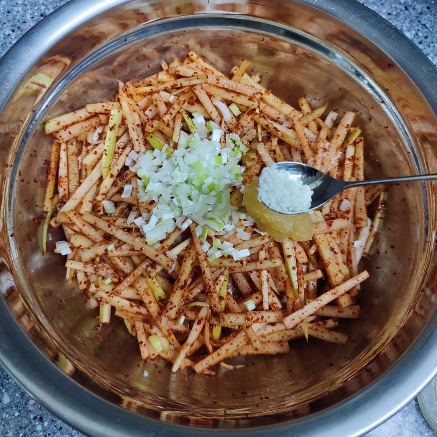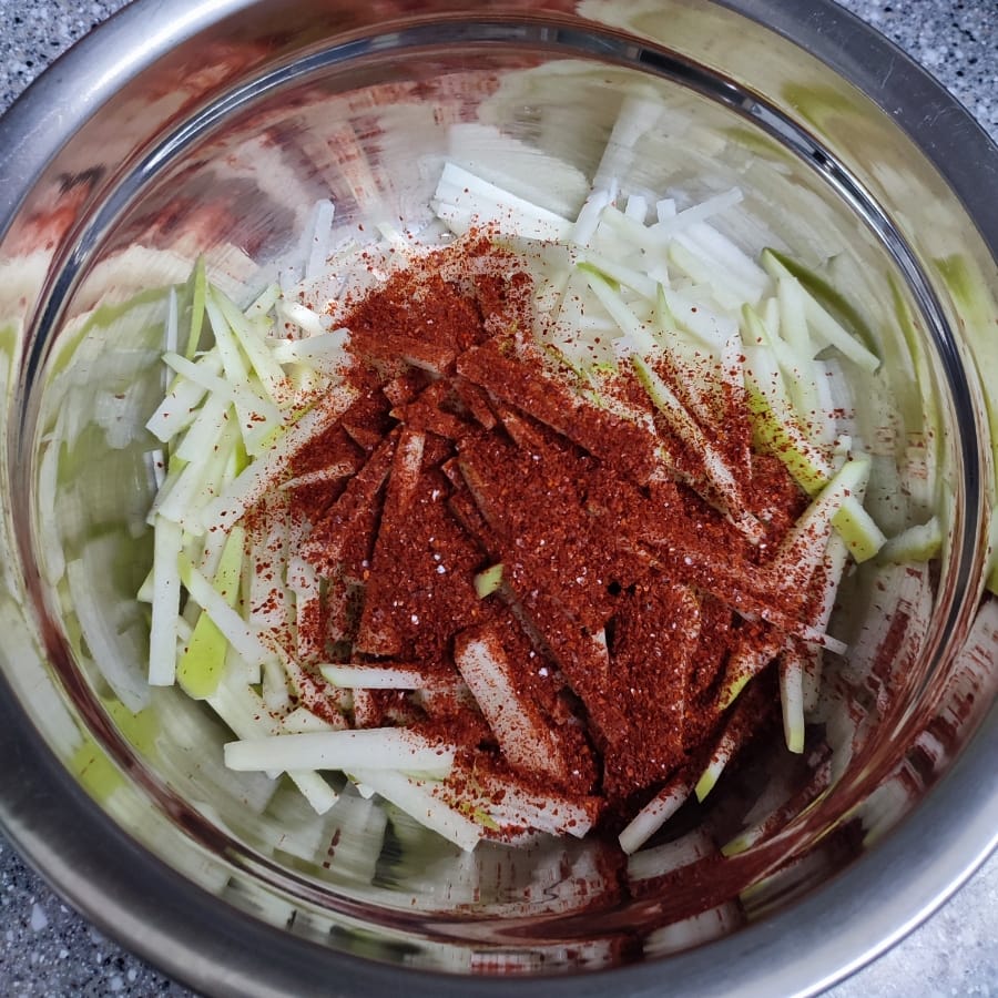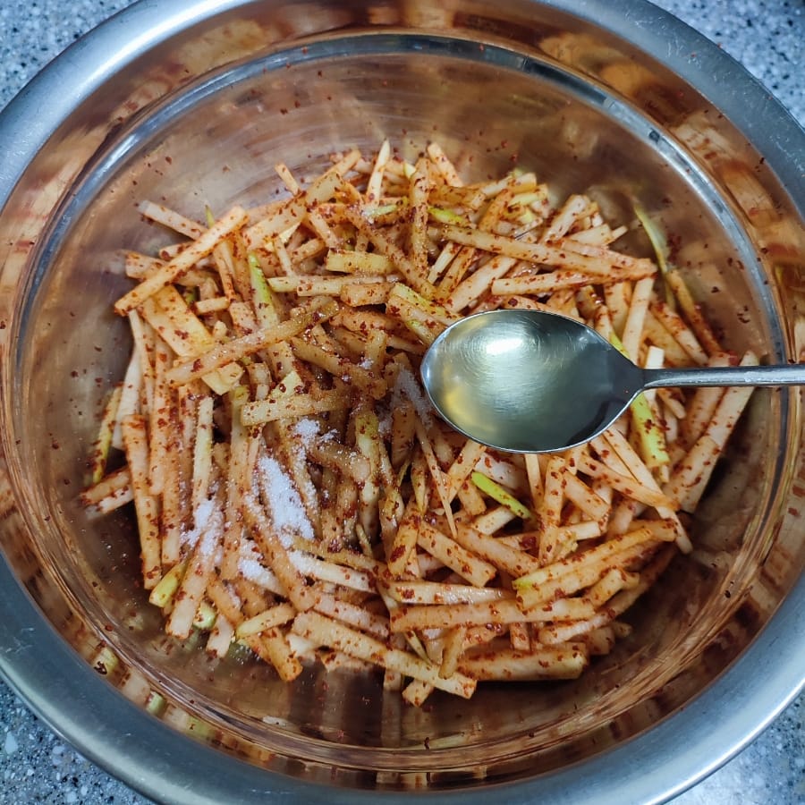 볼에 무채와 고춧가루를 넣고 버무린 뒤