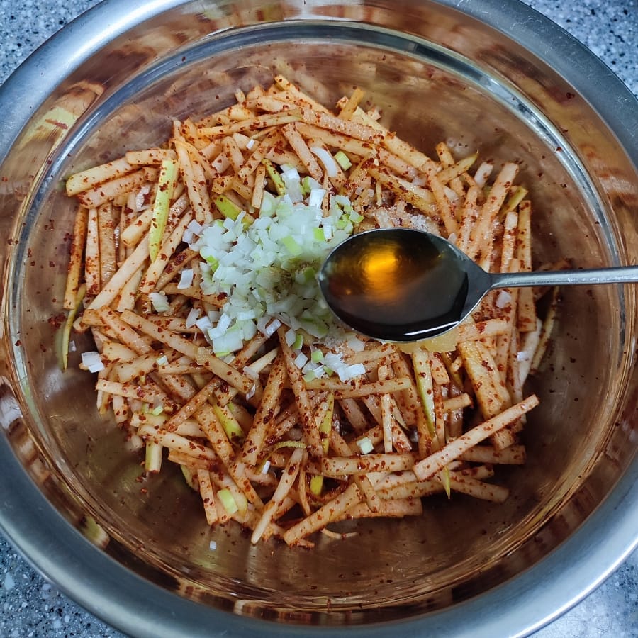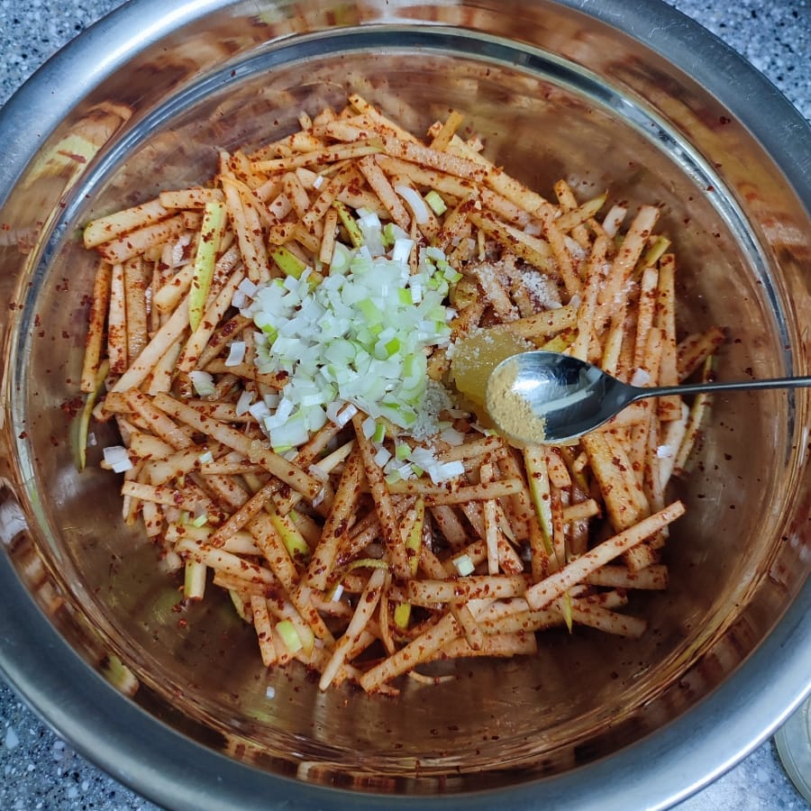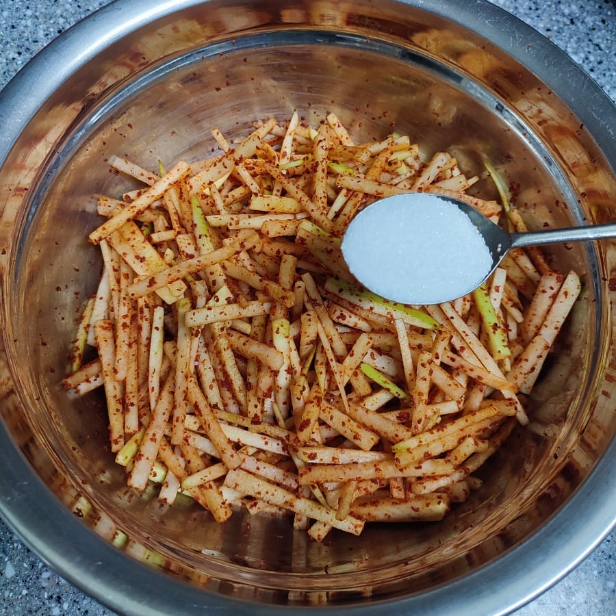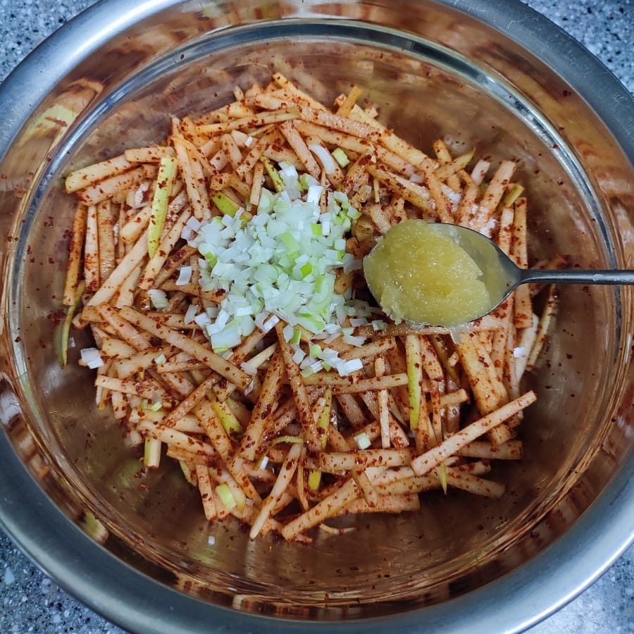 볼에 무채와 고춧가루를 넣고 버무린 뒤