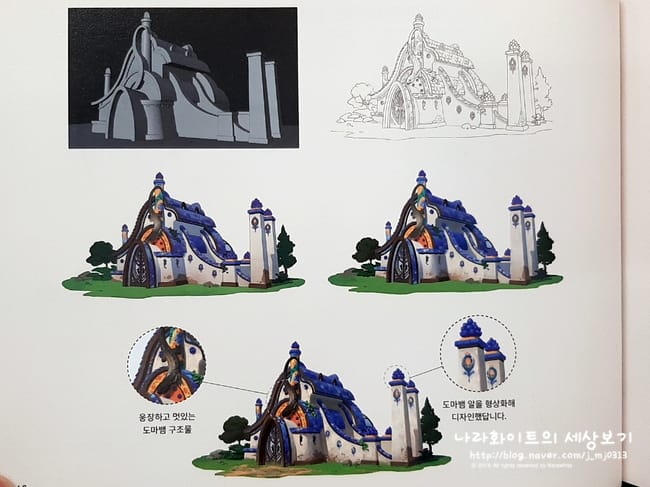 아이디어를 어떻게 얻었는지 그것을 스케치하고 고유색을 넣는 법, 채색과 블록아웃 만드는 법 등이 상세하게 있다.