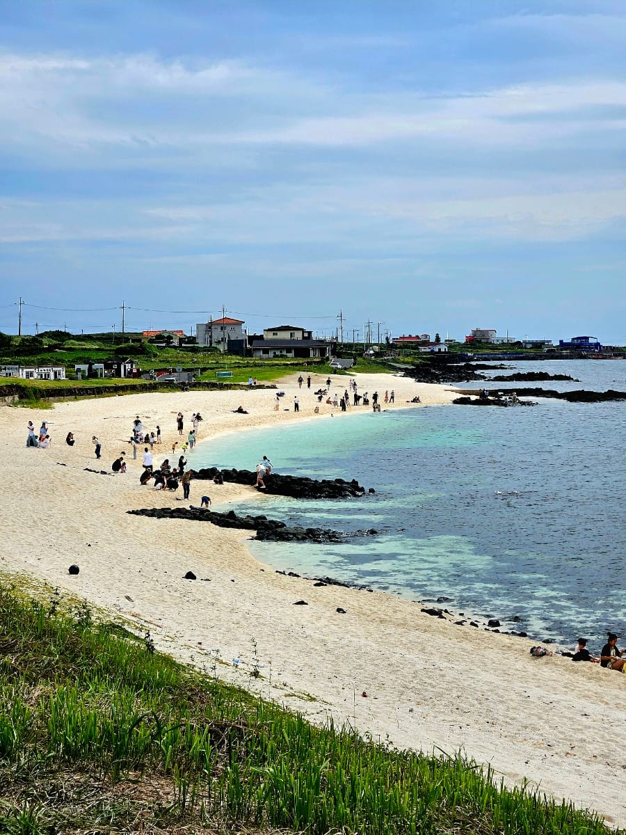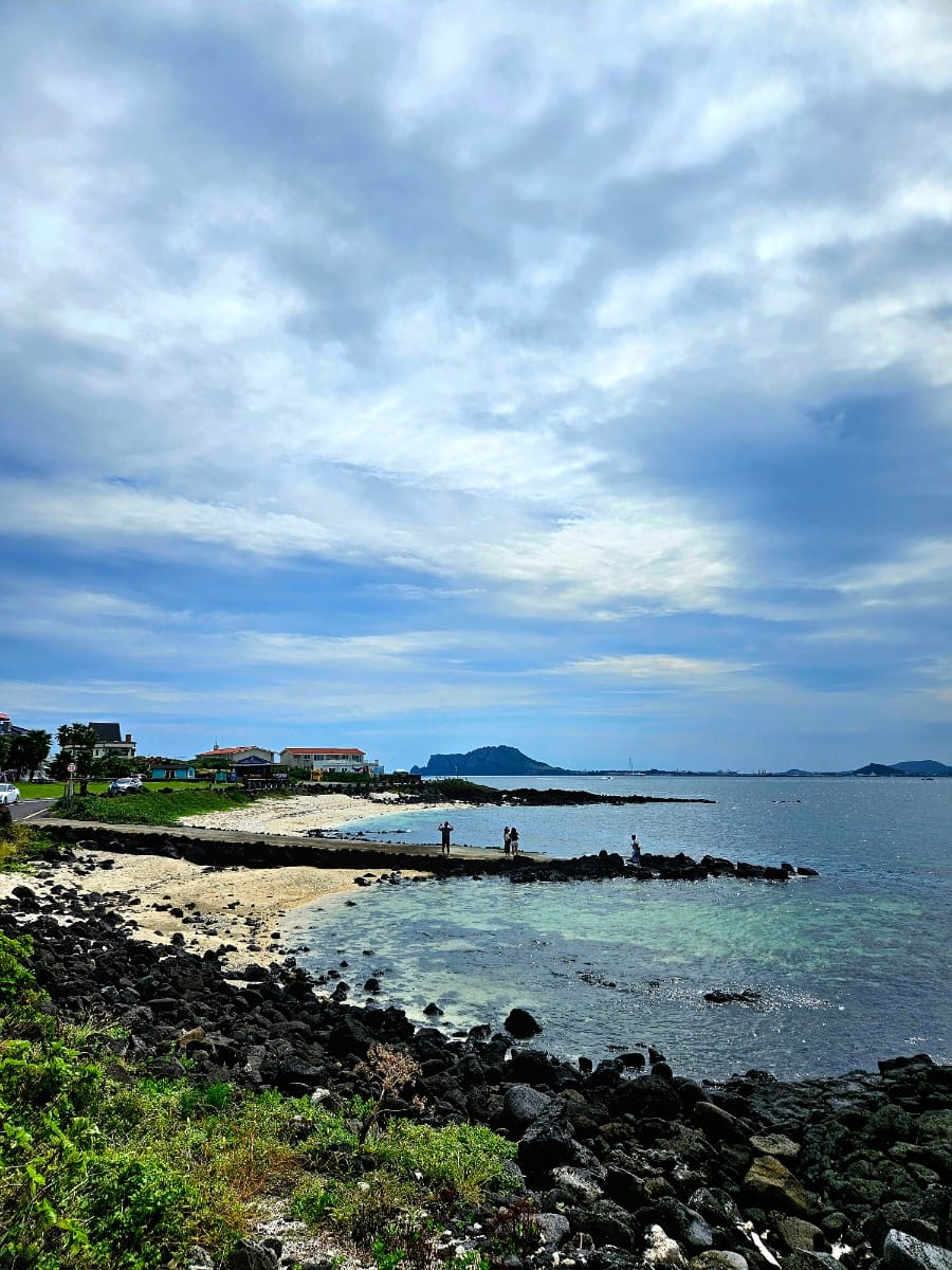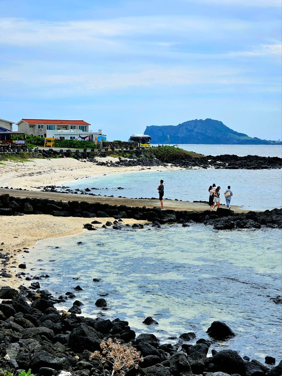 서빈백사. 해가 살짝 비추니 바닷빛깔이 진짜 에메랄드빛이 나온다. 그 뒤로 보이는 성산일출봉도 멋지고.