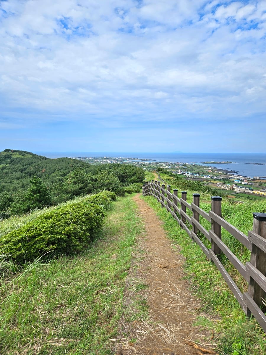 중간쯤 올랐을 때 뒤돌아보니 어우. 이렇게 쉽게 이런 멋진 풍경을 맛볼 수 있다니 황홀하다. 반대편 제주 쪽엔 다랑쉬오름과 이름모를 여러 오름들이 봉긋봉긋 예술이다.