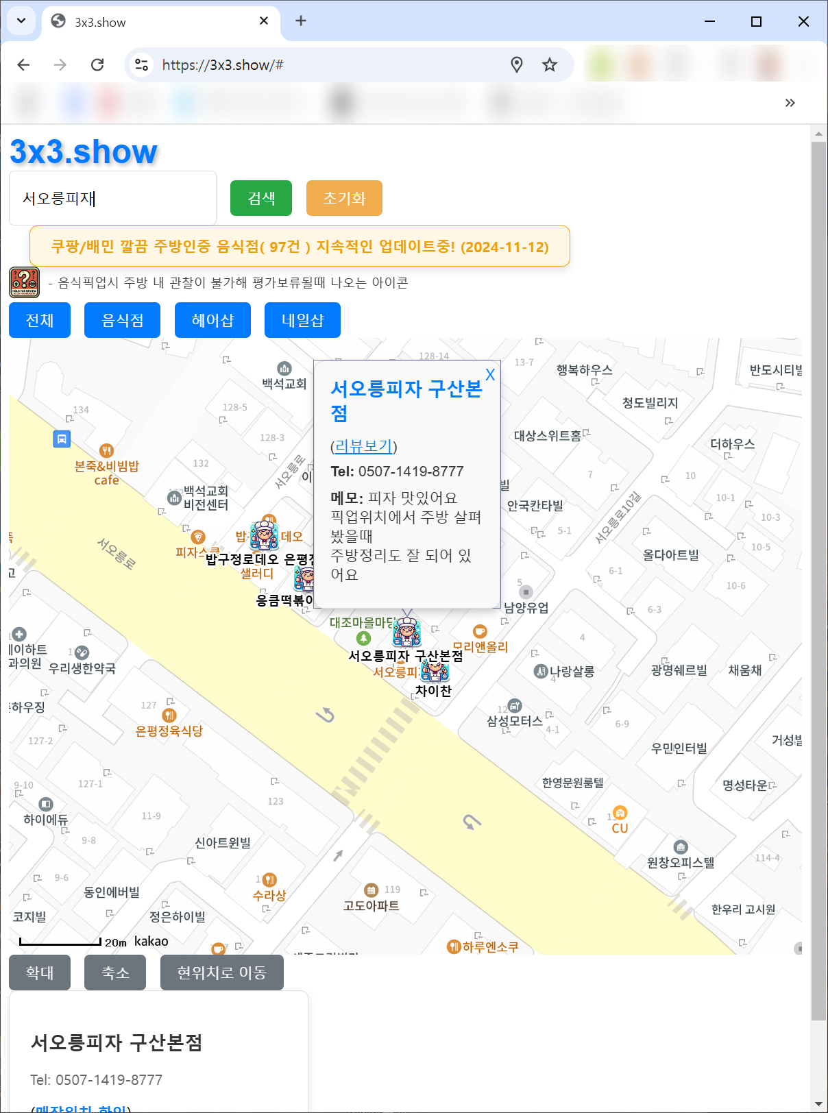 쿠팡이츠 , 배민의 배달음식 픽업하면서 만든 음식점 지도 3x3.show 입니다