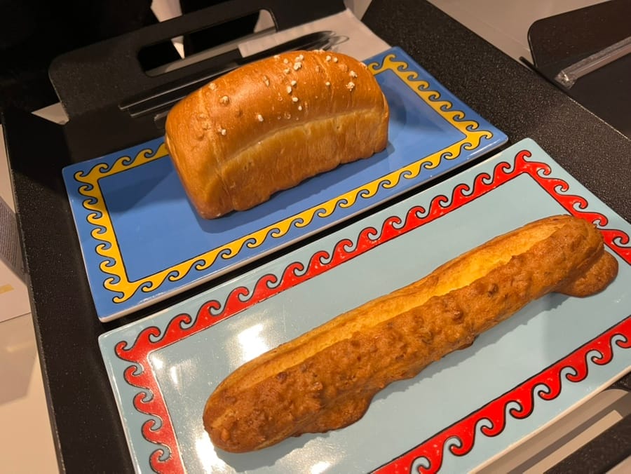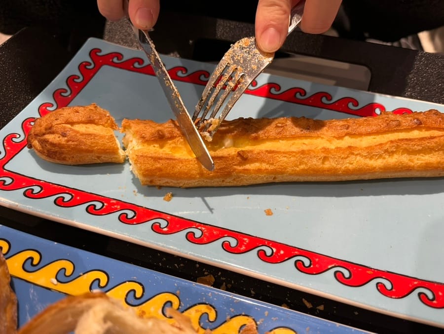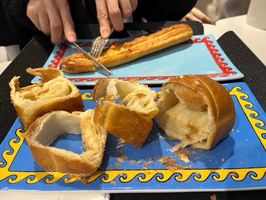 소금빵과 크로칸슈를 먹기 좋게 잘라줍니다