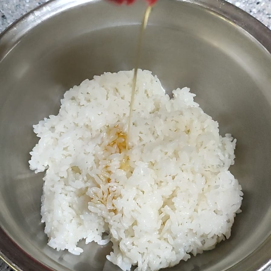 그 위에 밥을 얇게 펴고 숭어회를 가지런히 올려요.
