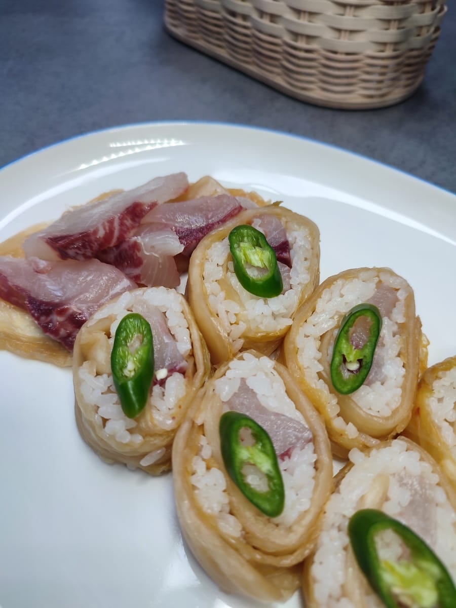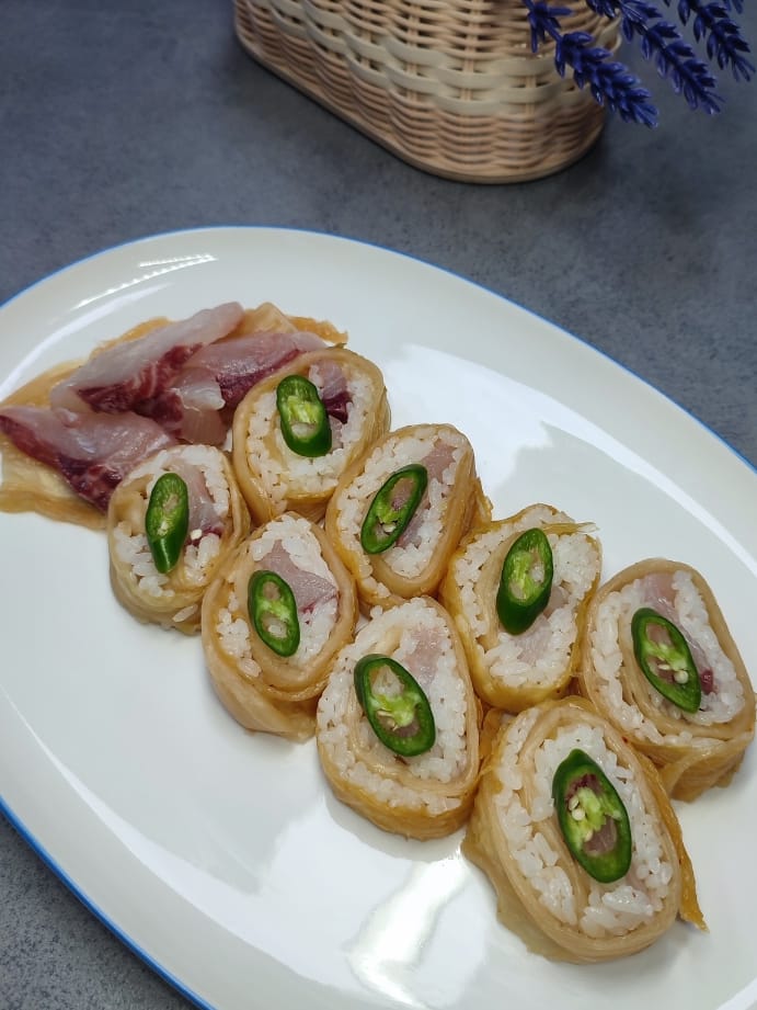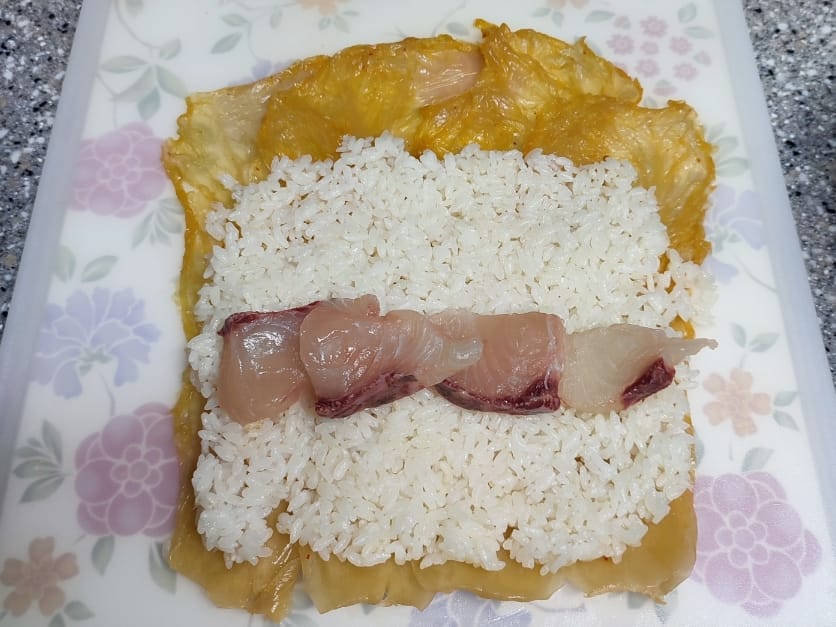 묵은지에 밥을 얇게 펴고 숭어회를 올려
