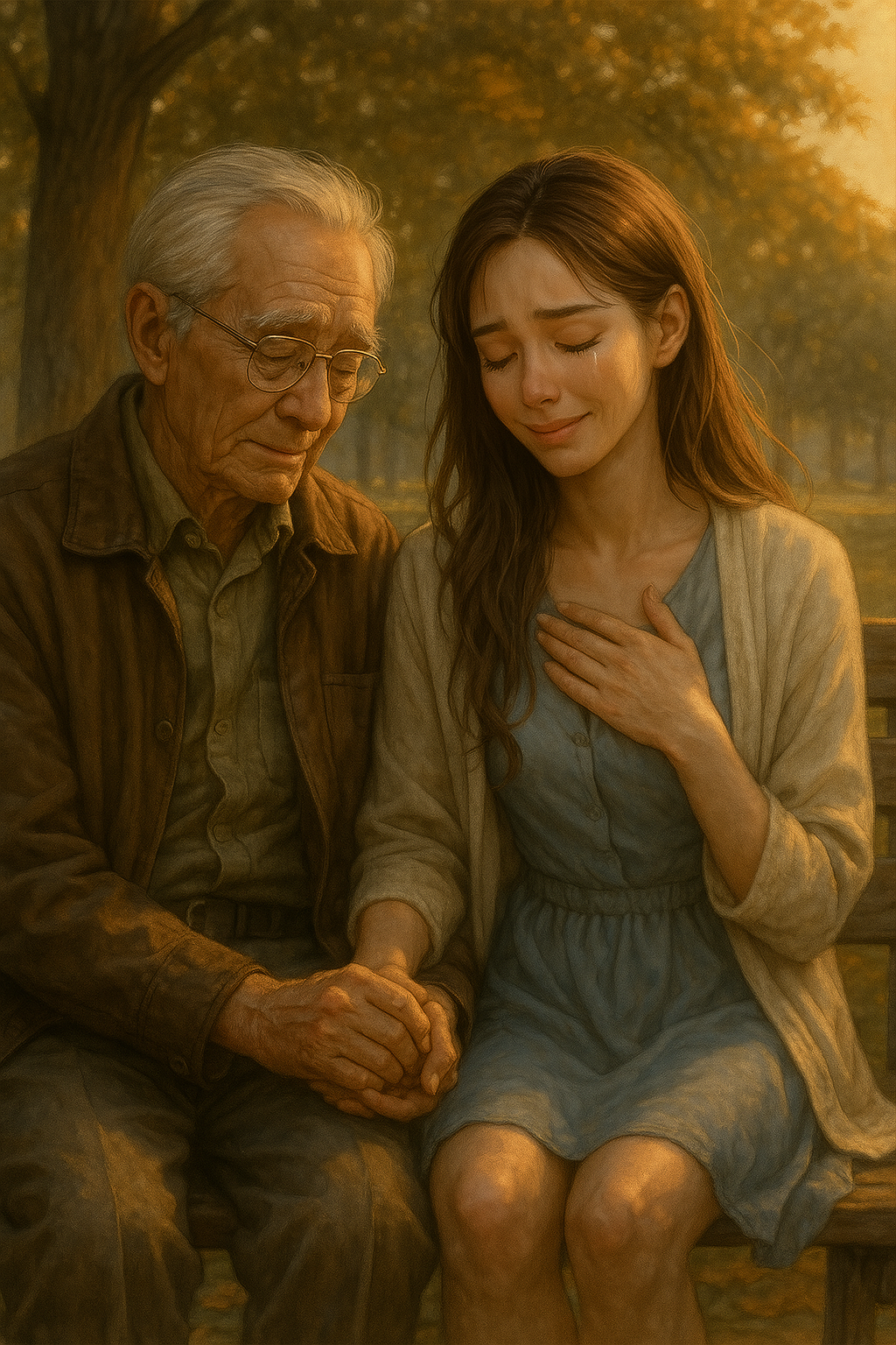 조용한 공원, 노을빛이 길게 드리워진 늦은 오후.