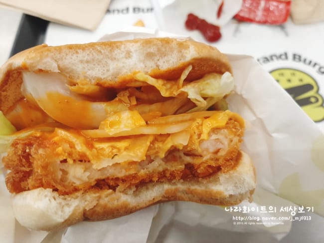 보통 새우버거가 흰 소스 많이 쓰는데 여긴 비스크 소스라고 주황색 소스를 썼다.