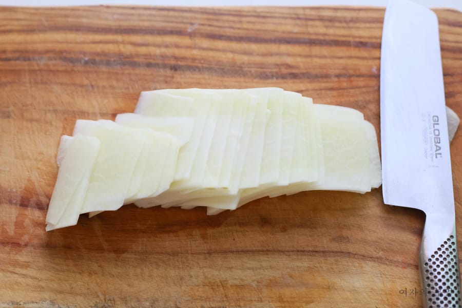 가늘게 채썰기 위해서 얇게 슬라이스한다.