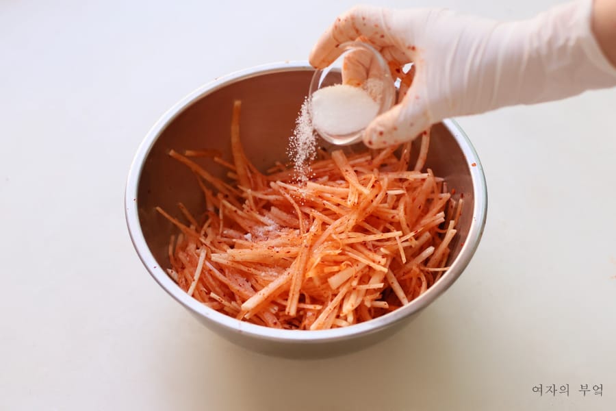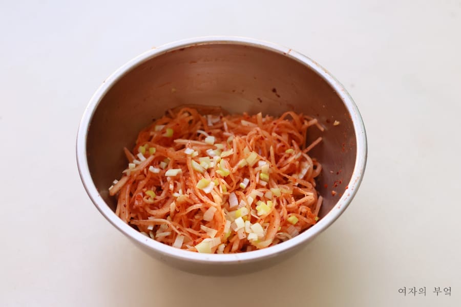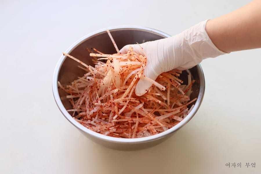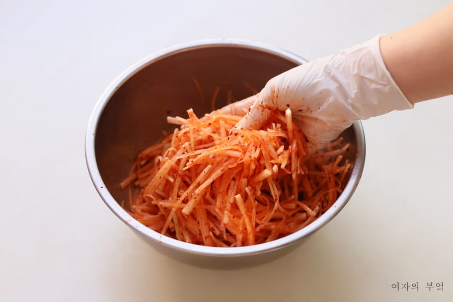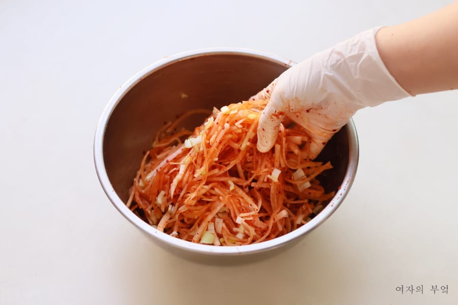 무채에 곱게 물이 들면 남은 양념을 모두 넣고 무친다.